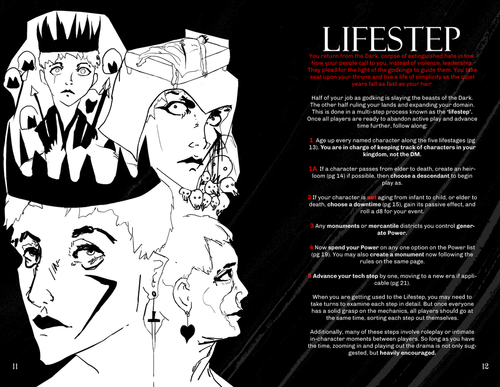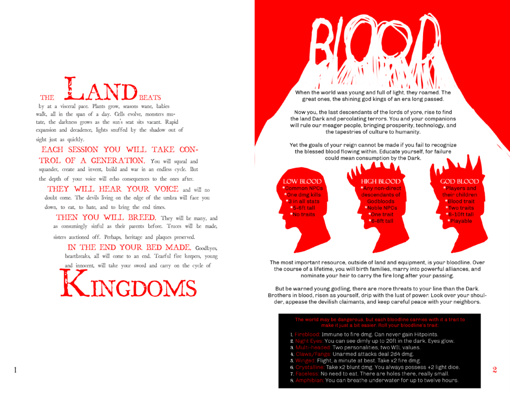 The story of mankind is yours to tell in Kingdoms. The players will hammer the foundations of human civilization in a sunless world through slaying the monstrosities of their era and assuming the role of their successors to continue the heroic lineage. Will your blood stand for strength in the face of the Dark? Strive for ingenuous discoveries to avoid bloodshed? Enforce mankind's divine right of conquest by trapping and bending the horrors of the Dark to their will? or Will your kingdom fall from heaven having squandered the resources accumulated from their mythic roots?