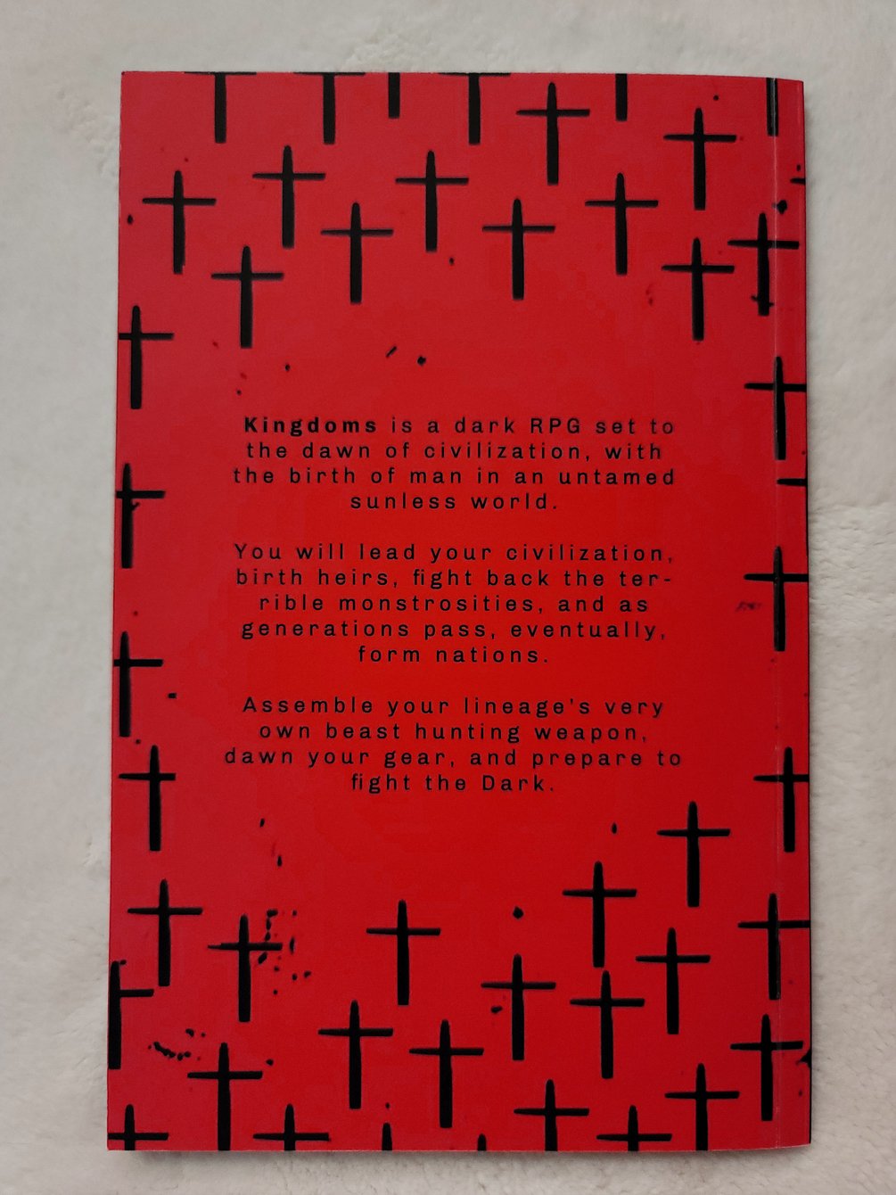 The story of mankind is yours to tell in Kingdoms. The players will hammer the foundations of human civilization in a sunless world through slaying the monstrosities of their era and assuming the role of their successors to continue the heroic lineage. Will your blood stand for strength in the face of the Dark? Strive for ingenuous discoveries to avoid bloodshed? Enforce mankind's divine right of conquest by trapping and bending the horrors of the Dark to their will? or Will your kingdom fall from heaven having squandered the resources accumulated from their mythic roots?